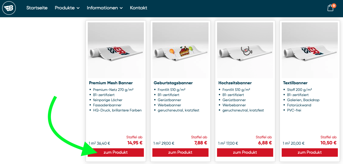 1. Suchen Sie sich das gewünschte Material zum Beispiel über die Kategorieseite Werbebanner aus und klicken Sie auf zum Produkt.
